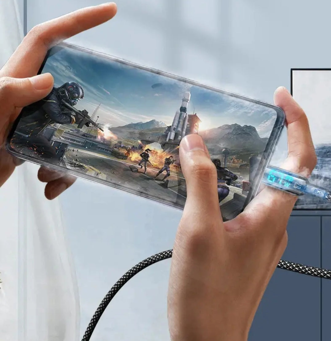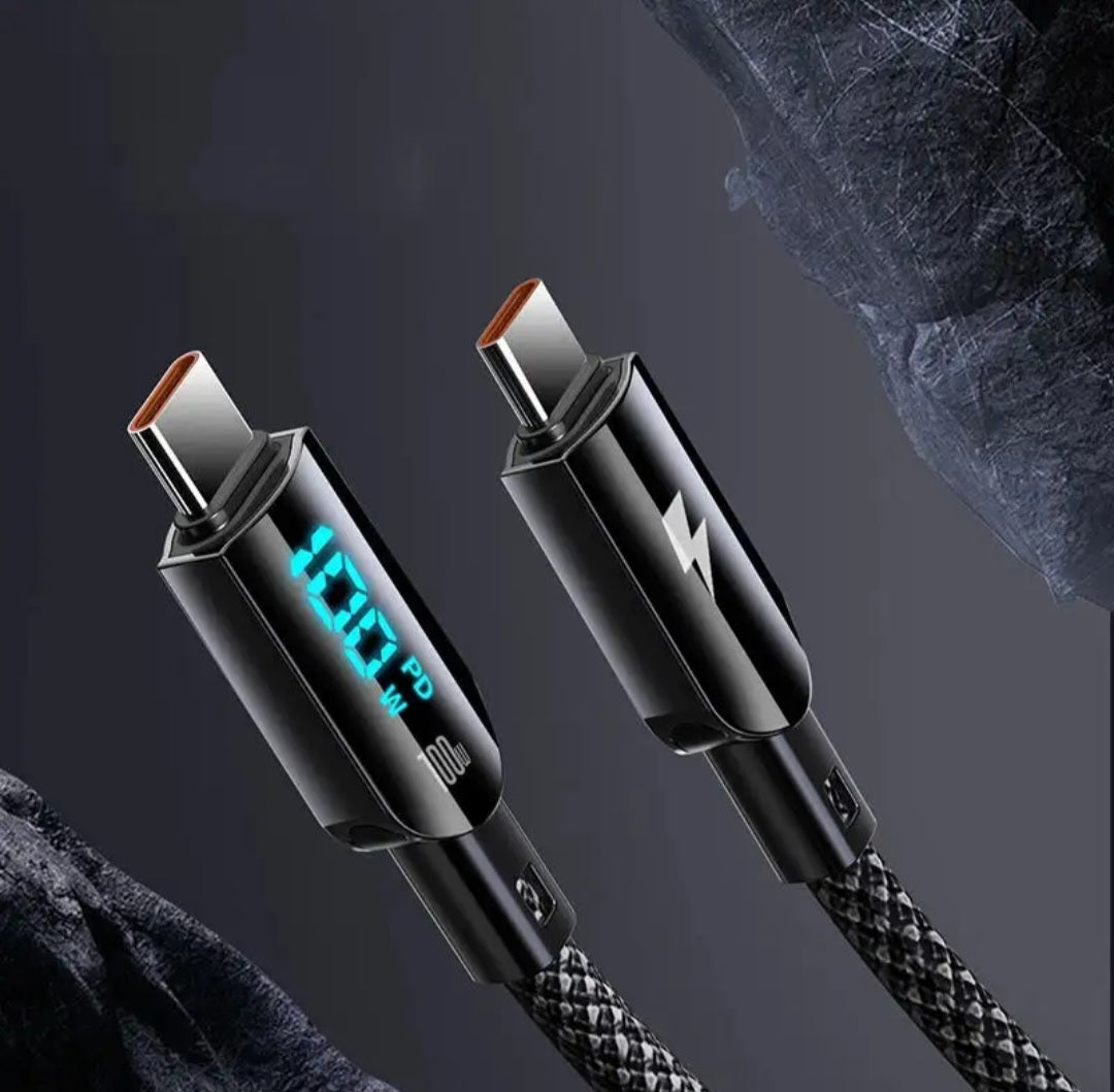 This is a braided USB-C to USB-C fast charging cable with an LED display.